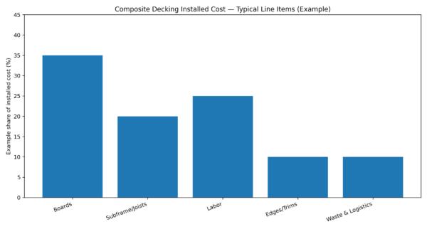 Example only: installed cost tends to split across boards, subframe, labor, edges/trims, and waste/logistics. Your mix shifts by site type.